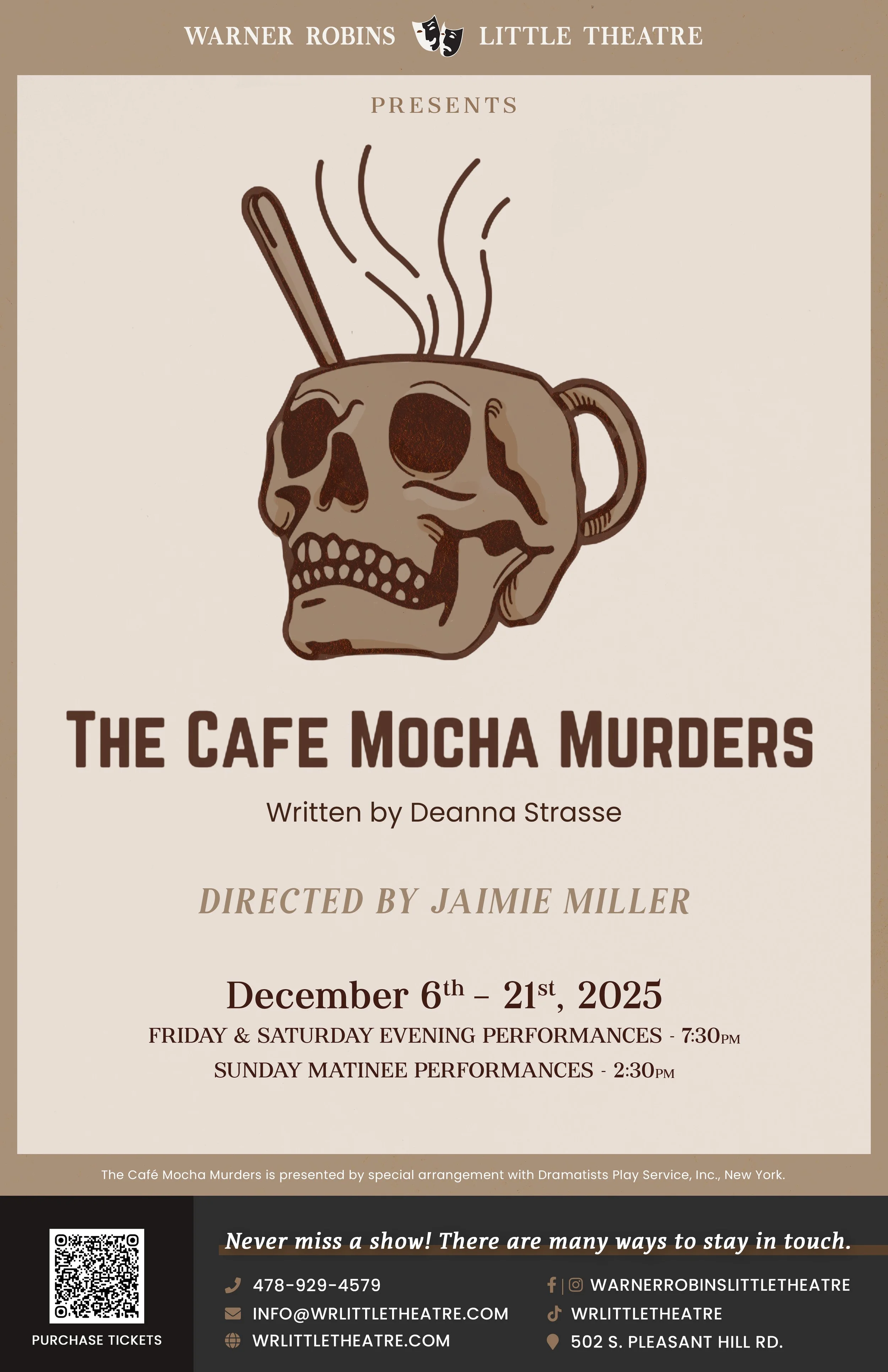 The Café Mocha Murders is a laugh-out-loud whodunit, brewed with suspense, comedy, and just the right amount of caffeine. Your ticket includes coffee and dessert, so you can sip, snack, and sleuth along with the cast! Don’t miss this hilarious and cozy mystery — seats are filling faster than a fresh pot of coffee!”